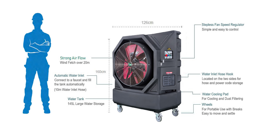 De Ya Suh Dar M702-COOL verdampingskoeler is een mobiele, adiabatische luchtkoeler voor professioneel gebruik. Dit toestel maakt deel uit van de Ya Suh Dar-serie en is bijzonder geschikt voor het koelen van zowel binnen- als buitenruimtes. Het plug-and-play toestel zorgt voor aangename temperaturen in fabrieken, industriële en productieomgevingen, restaurants en hotels. Geschikt voor oppervlakken tot 220 m² met een luchtcirculatie van 22.000 m³ per uur. Een adiabatische koeler koelt niet alleen de omgevingslucht, maar filtert ook stof en vuildeeltjes.